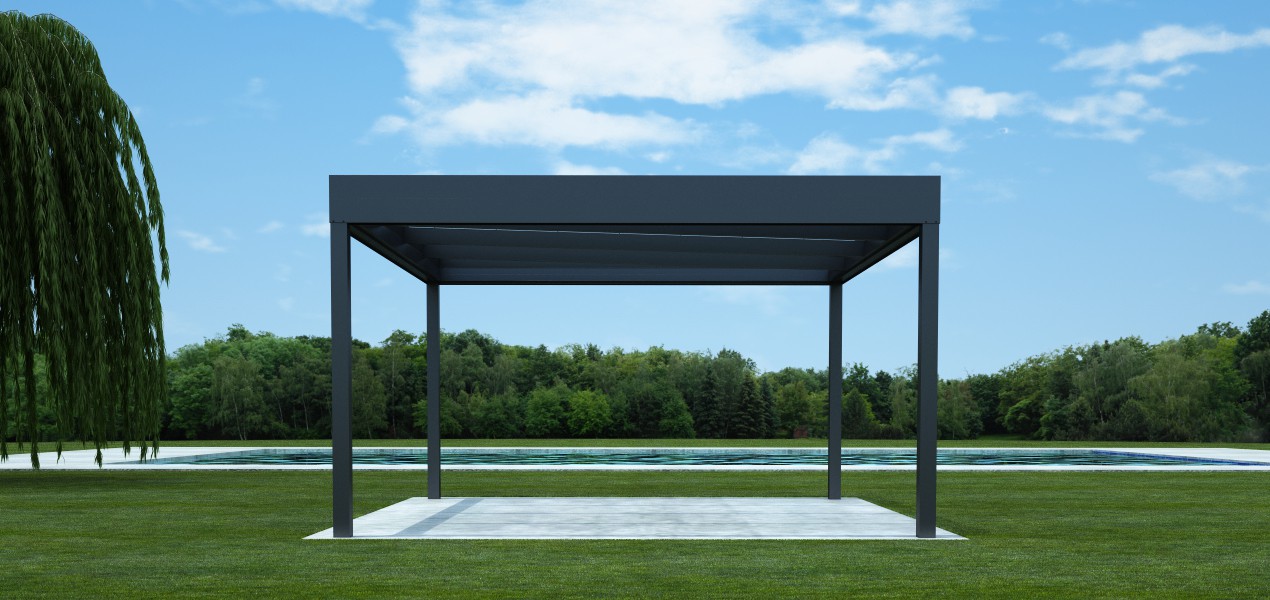 Unsere Systemkonstruktion können Sie überall auf freien Flächen nutzen. Die Dachneigung ist hinter erhöhten Seitenprofilen versteckt. Daher wirkt das Dach, als hätte es keine Neigung. Das Ergebnis ist ein modernes und luftiges Erscheinungsbild.